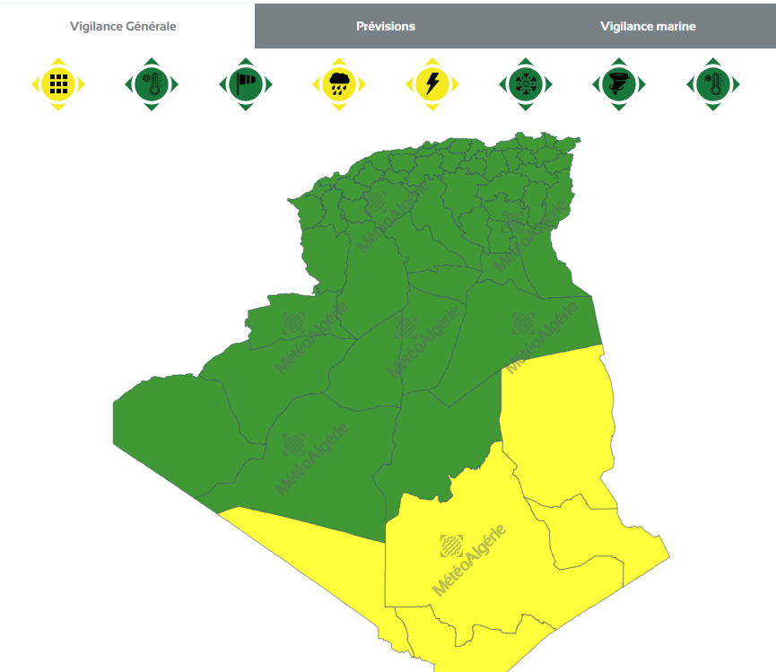 وحسب تنبيه من المستوى الأول للديوان الوطني للأرصاد الجوية فإن الولايات المعنية هي: عين قزام، برج باجي مختار، تمنراست، جانت وإليزي.