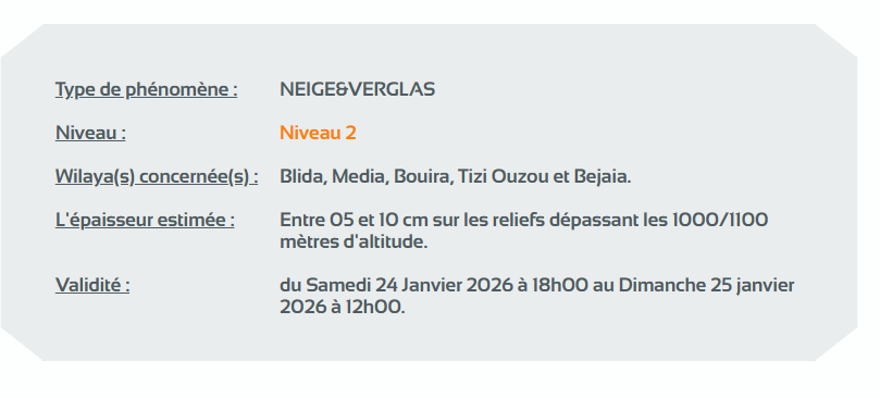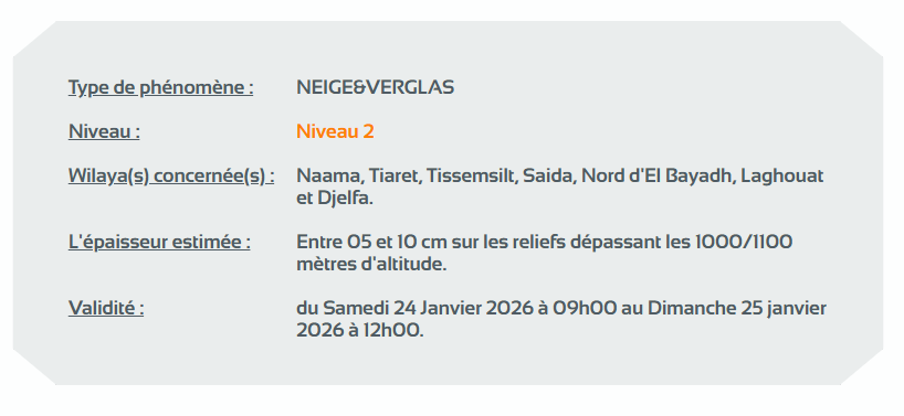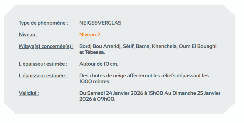 وحسب تنبيه آخر للديوان الوطني للأرصاد الجوية من المستوى الثاني باللون البرتقالي على خريطة اليقظة، فإن الولايات المعنية بتساقط التلوج التي يتراوح سمكها بين 05 و10 سنتيمتر على المناطق التي يزيد ارتفاعها عن 1100/1000 متر، إلى غاية الساعة 12 زوالا من اليوم الأحد هي: البليدة، المدية، البويرة، تيزي وزو، بجاية، النعامة، تيارت، تيسمسيلت، سعيدة، شمال البيض، الأغواط، الجلفة، برج بوعريريج، سطيف، باتنة، خنشلة، أم البواقي وتبسة.