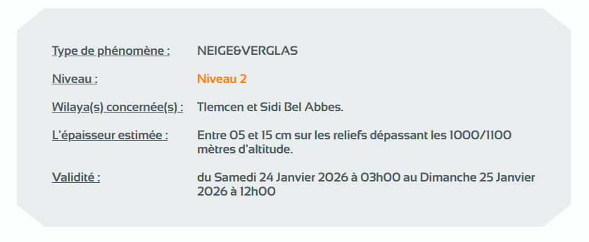 وحسب تنبيه للديوان الوطني للأرصاد الجوية من المستوى الثاني باللون البرتقالي على خريطة اليقظة، فإن الولايات المعنية بتساقط الثلوج التي يتراوح سمكها بين 05 و15 سنتيمتر على المناطق التي يزيد ارتفاعها عن 1100/1000 متر، هي: تلمسان وسيدي بلعباس.
