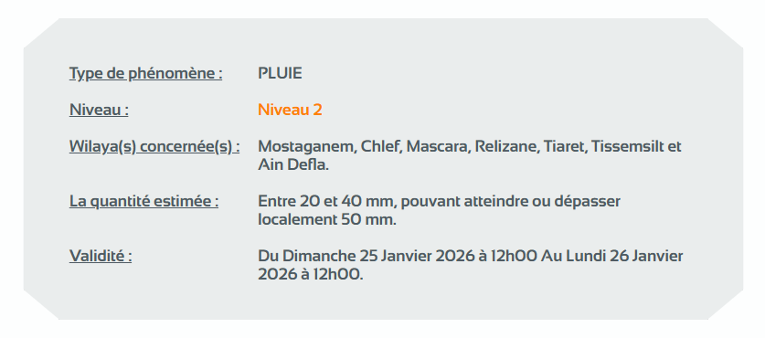 وحسب تنبيه للديوان الوطني للأرصاد الجوية من المستوى الثاني باللون البرتقالي على خريطة اليقظة، فإن الولايات المعنية بتساقط الأمطار التي تتراوح بين 20 و40 ملم، وقد تصل إلى 50 ملم أو تتجاوزها محلياً هي: مستغانم، الشلف، معسكر، غليزان، تيارت، تيسمسيلت وعين الدفلى.