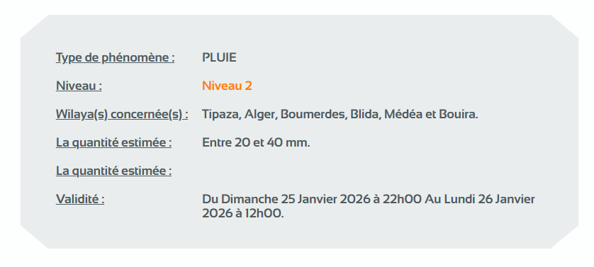 وحسب تنبيه آخر للديوان الوطني للأرصاد الجوية من المستوى الثاني باللون البرتقالي على خريطة اليقظة، فإن الولايات المعنية بتساقط الأمطار التي تتراوح بين 20 و40 ملم من الساعة العاشرة مساءً من اليوم الأحد إلى غاية الساعة 12 ليلا من يوم غد الإثنين هي: الجزائر العاصمة، تيبازة، بومرداس، البليدة، المدية، البويرة.
