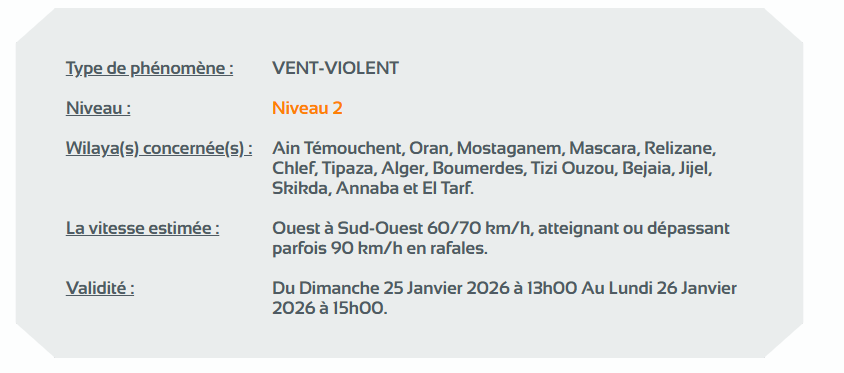 كما نبه الديوان في نشرية أخرى من المستوى الثاني باللون البرتقالي على خريطة اليقظة، من رياح قوية تتراوح بين 60 كلم/سا و70 كلم/سا وقد تصل أحيانًا إلى 90 كم/سا من الساعة الواحدة بعد الزوال من اليوم الأحد إلى غاية الساعة الثالثة بعد الزوال من يوم غد الإثنين على ولايات: عين تموشنت، وهران، مستغانم، معسكر، غليزان، الشلف، تيبازة، الجزائر العاصمة، بومرداس، تيزي وزو، بجاية، جيجل، سكيكدة، عنابة والطارف.