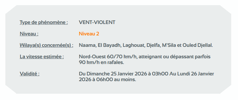 كما نبه الديوان في نشرية أخرى من المستوى الثاني باللون البرتقالي على خريطة اليقظة، من رياح قوية تتراوح بين 60 كلم/سا و70 كلم/سا وقد تصل أحيانًا إلى 90 كم/سا من الساعة الثالثة صباحا من اليوم الأحد إلى غاية الساعة السادسة صباحا من يوم غد الإثنين على ولايات: النعامة، البيض، الأغواط، الجلفة، المسيلة وأولاد جلال.