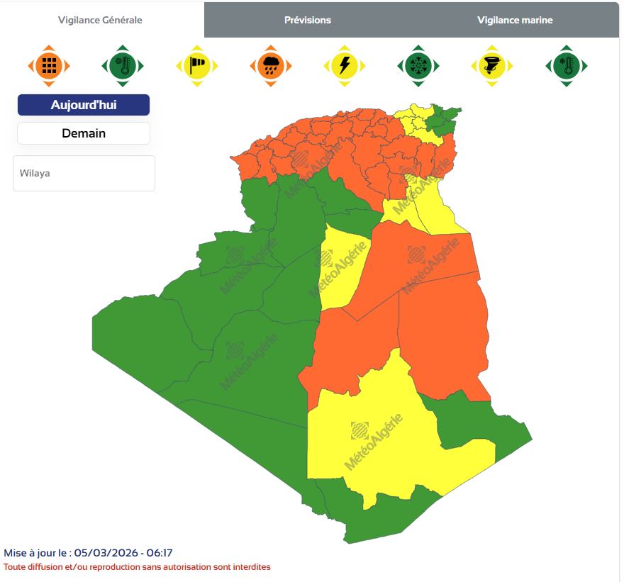 نبه الديوان الوطني للأرصاد الجوية في نشرية حول حالة الطقس ليوم الخميس، من تساقط أمطار رعدية إلى جانب هبوب رياح قوية عبر عدة ولايات.