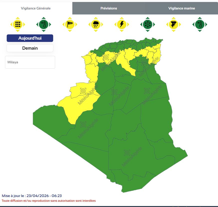 وحسب تنبيه من المستوى الأول جاء باللون الأصفر، فإن الولايات المعنية بتساقط الأمطار هي: سوق أهراس، تبسة، خنشلة، أم البواقي، باتنة، المسيلة، الجلفة، تيارت، سعيدة، سيدي بلعباس، تلمسان، عين تموشنت، النعامة، بشار، بني عباس.