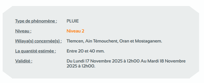 وحسب تنبيه للديوان الوطني للأرصاد الجوية من المستوى الثاني باللون البرتقالي على خريطة اليقظة، فإن الولايات المعنية بتساقط الأمطار التي تتراوح بين 20 ملم و40 ملم إلى غاية الساعة السادسة 12 ظُهرا من اليوم الثلاثاء هي: تلمسان، عين تموشنت، وهران ومستغانم.