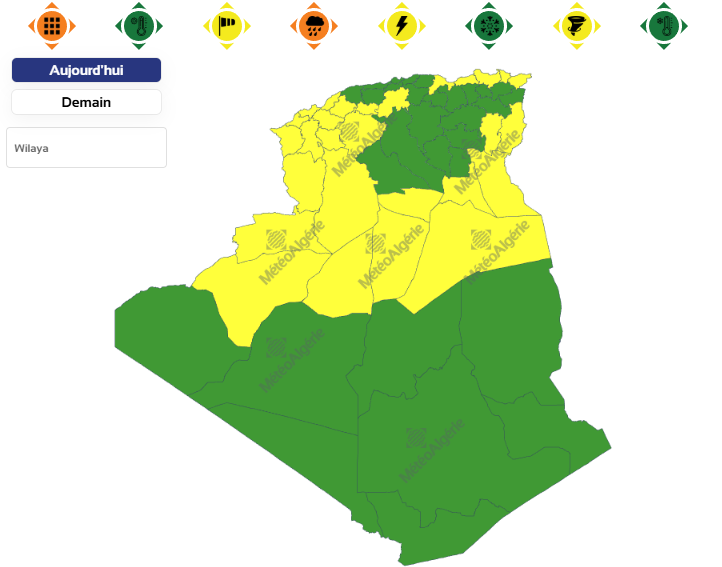 وحسب تنبيه آخر للديوان من المستوى الأول باللون الأصفر على خريطة اليقظة، ستتساقط الأمطار من الساعة التاسعة صباحا من اليوم الثلاثاء لغاية الساعة 12 ليلا من نفس اليوم على ولايات: سيدي بلعباس، ورقلة، الوادي، تيسمسيلت، غليزان، بجاية، غرداية، تقرت، بني عباس، تيارت، تبسة، عنابة، المنيعة، سكيكدة، البيض، جيجل، خنشلة، المدية، الطارف، سعيدة، النعامة، معسكر، وبشار.