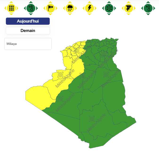 وحسب تنبيه للديوان الوطني للأرصاد الجوية من المستوى الأول باللون الأصفر على خريطة اليقظة، فإن الولايات المعنية بنشاط الخلايا الرعدية والأمطار بداية من التاسعة صباحا من اليوم السبت لغاية الساعة السادسة صباحا من يوم غد الأحد هي: تيبازة، الشلف، عين الدفلى، مستغانم، تيسمسيلت، غيليزان، تيارت، معسكر، وهران، سعيدة، سيدي بلعباس، تلمسان، عين تموشنت، النعامة، البيض، بشار، بني عباس وتيندوف.