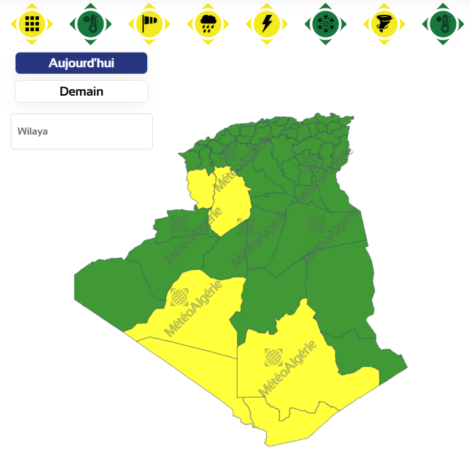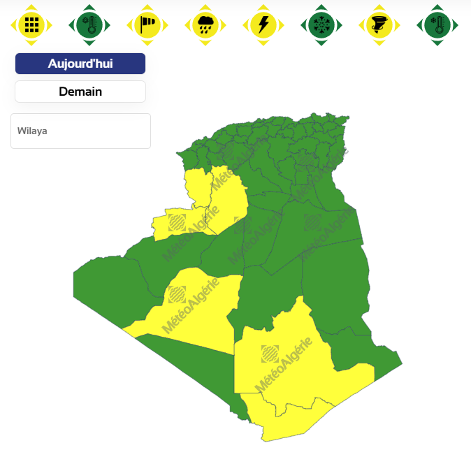 وحسب ذات التنبيه، ستكون الرياح العاتية بداية من الساعة التاسعة صباحا من اليوم السبت لغاية الساعة التاسعة مساءً من نفس اليوم على ولايات: النعامة، البيض، بشار، أدرار، تمنراست وعين قزام.