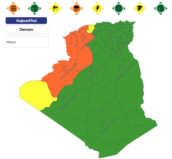 وحسب تنبيه للديوان الوطني للأرصاد الجوية من المستوى الثاني باللون البرتقالي على خريطة اليقظة، فإن الولايات المعنية بنشاط الخلايا الرعدية والأمطار التي تتراوح بين 20 و30 ملم وقد تصل أو تتجاوز أحيانا الـ 40 ملم محليا بداية من التاسعة صباحا من اليوم السبت لغاية الساعة 12 ظُهرا من يوم غد الأحد هي: الشلف، مستغانم، غيليزان، تيارت، معسكر، وهران، سعيدة، سيدي بلعباس، تلمسان، عين تموشنت، النعامة، البيض، بشار وبني عباس.
