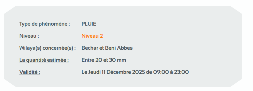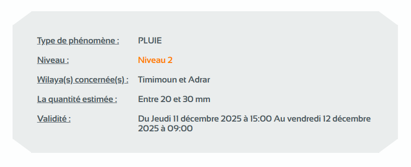 وحسب تنبيه للديوان الوطني للأرصاد الجوية من المستوى الثاني باللون البرتقالي على خريطة اليقظة، فإن الولايات المعنية بتساقط الأمطار التي تتراوح بين 20 ملم و30 ملم من الساعة التاسعة صباحا من اليوم الخميس إلى غاية الساعة التاسعة صباحا من يوم غد الجمعة هي: بشار، بني عباس، تيميمون، أدرار.