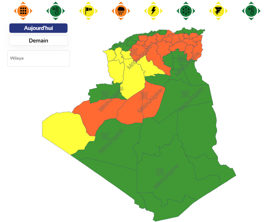 وأفادت النشرية التي حملت تنبيها من المستوى الأول، أن الأمطار ستخص ولايات: سوق أهرس، تبسة، قالمة، أم البواقي، خنشلة، قسنطينة، ميلة، سطيف، باتنة، برج بوعريريج، المسيلة، البويرة، البليدة، تيبازة، عين الدفلى، المدية، تيسمسيلت، الجلفة، تيارت، الأغواط، سعيدة، سيدي بلعباس، تلمسان، البيض، النعامة، المنيعة، تيميمون، بني عباس وتندوف.