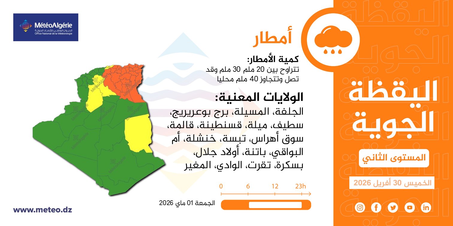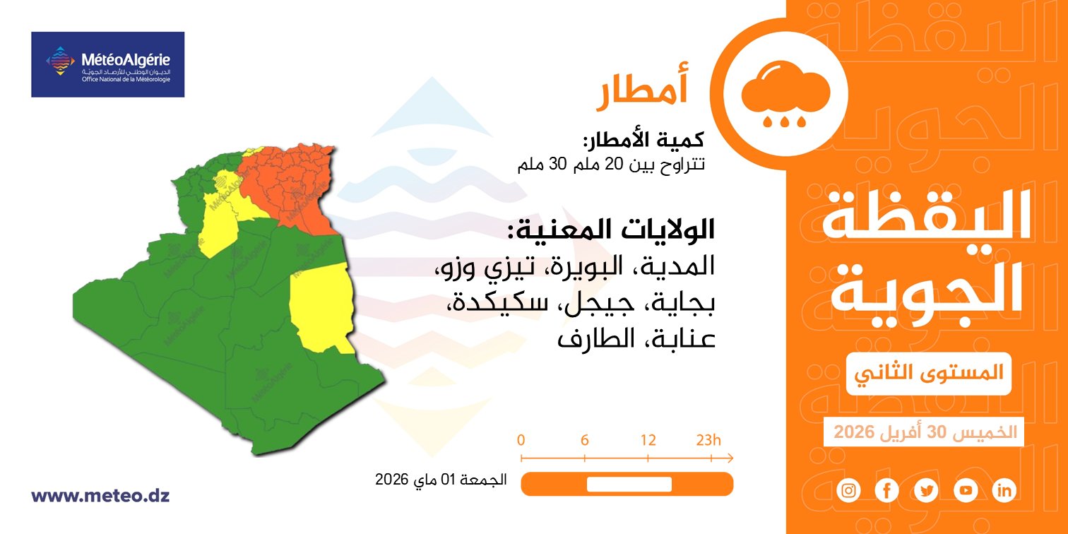 نبه الديوان الوطني للأرصاد الجوية في تنبيه جديد لحالة الطقس ليوم غد الجمعة، من تساقط أمطار غزيرة عبر عدة ولايات.