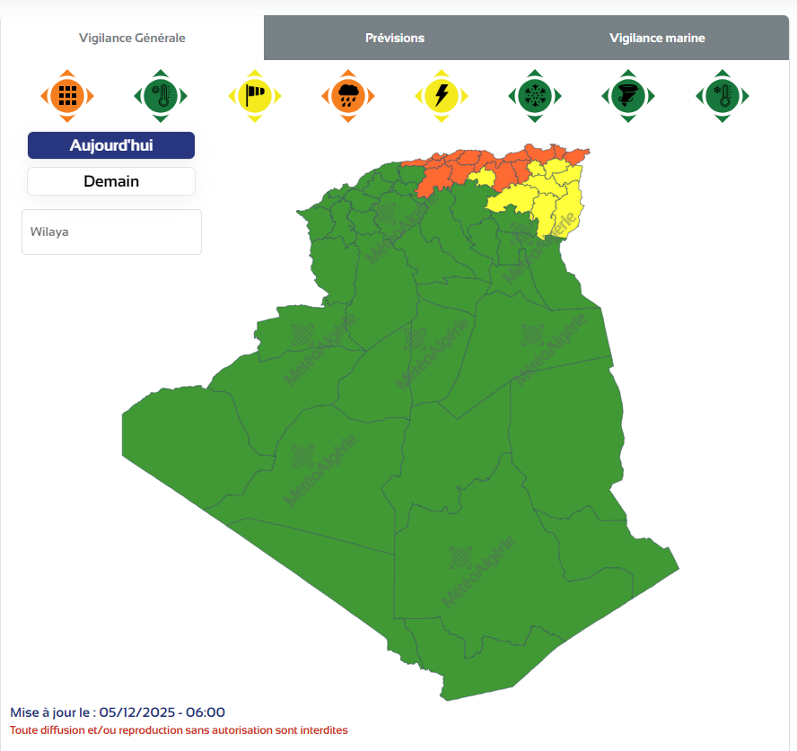 وحسب تنبيه من المستويين الأول والثاني فإن الولايات المعنية بتساقط الأمطار هي: سوق أهراس، برج بوعريريج، أم البواقي، تبسة، قالمة، باتنة، قسنطينة، خنشلة، عين الدفلى، الجزائر، تيبازة، بجاية، ميلة، تيزي وزو، عنابة، سطيف، سكيكدة، جيجل، المدية، الطارف، بومرداس، البويرة، البليدة.