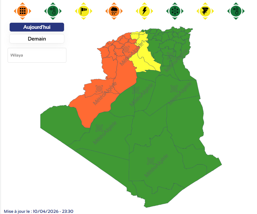كما نبهت النشرية من تساقط أمطار غزيرة عبر ولايات: وهران مستغانم، تيسمسيلت، تيارت والشلف.