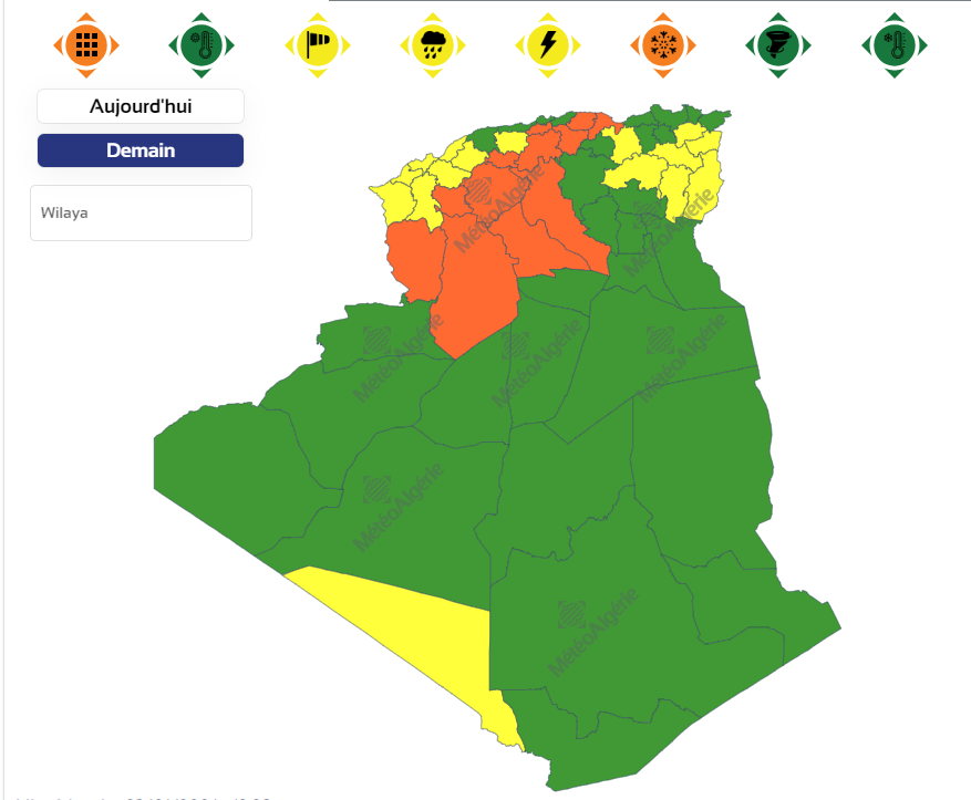 وحملت النشرية تنبيها حول تساقط أمطار غزيرة عبر ولايات: تلمسان، عين تيموشنت، وهران، مستغانم، غليزان ومعسكر.