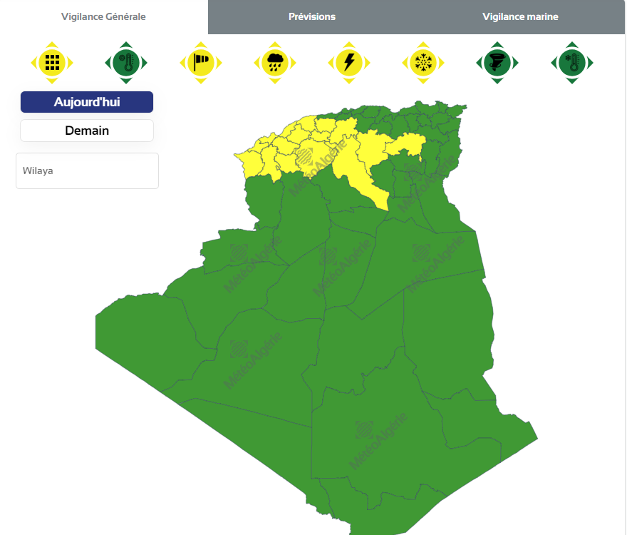 وحسب تنبيه من المستوى الأول جاء باللون الأصفر فإن الولايات المعنية بتساقط الأمطار هي: باتنة، المسيلة، الجلفة، المدية، عين الدفلى، تيسمسيلت، تيارت، الشلف، غليزان، معسكر، سعيدة، سيدي بلعباس، عين تيموشنت، وهران وتلمسان.