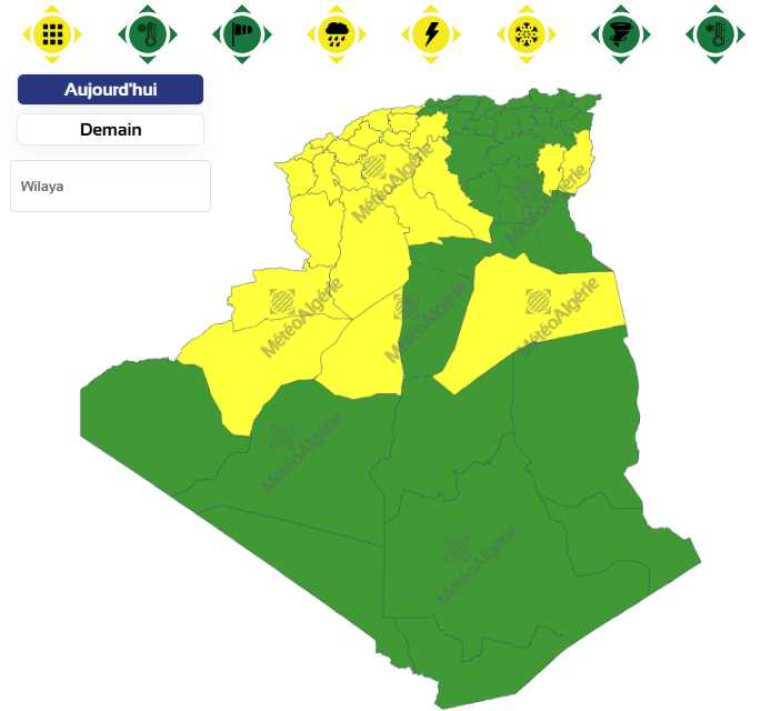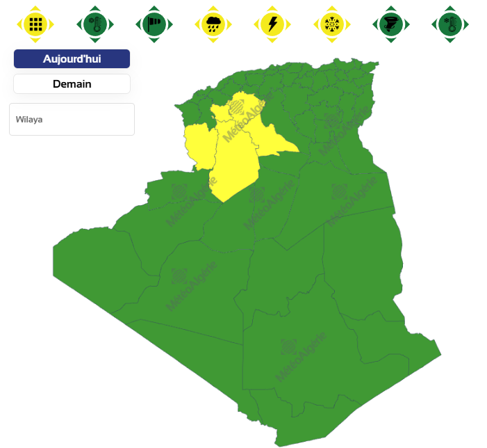 كما نبه الديوان في نشرية أخرى من المستوى الأول باللون الأصفر على خريطة اليقظة، بتساقط أمطار من الساعة الثالثة مساءً من اليوم الثلاثاء إلى غاية الساعة السادسة صباحا من يوم غد الأربعاء على ولايات: سيدي بلعباس، ورقلة، تيبازة، الوادي، تيسمسيلت، تيميمون، الأغواط، غليزان، غرداية، تقرت، بني عباس، المسيلة، تيارت، تبسة، عين صالح، الشلف، مستغانم، عين تموشنت، الجلفة، تلمسان، المنيعة، البيض، المغير، خنشلة، عين الدفلى، المدية، بسكرة، سعيدة، النعامة، معسكر، أولاد جلال، وهران وبشار.