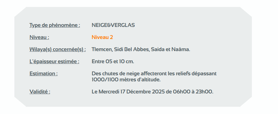وحسب تنبيه للديوان الوطني للأرصاد الجوية من المستوى الأول باللون الأصفر على خريطة اليقظة، فإن الولايات المعنية بتساقط الثلوج هي: تيارت، سعيدة، البيض والنعامة.