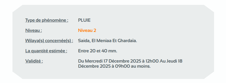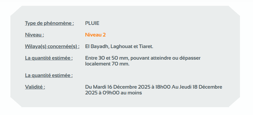 كما نبه الديوان في نشرية أخرى من المستوى الثاني باللون البرتقالي على خريطة اليقظة، بتساقط أمطار تتراوح بين 30 ملم و50 ملم وتصل أحيانا أو تتجاوز محليا الـ 70 ملم من الساعة 12 زوالا من الساعة السادسة صباحاً من اليوم الثلاثاء إلى غاية الساعة التاسعة صباحا من يوم الخميس على ولايات: البيض، الأغواط وتيارت.
