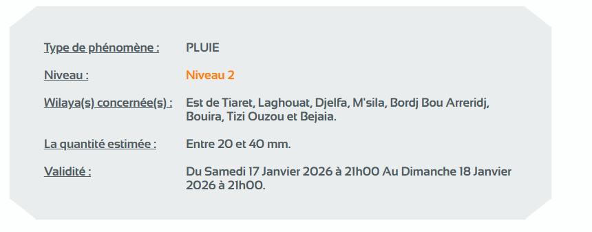 كما نبه الديوان في نشرية أخرى من المستوى الثاني باللون البرتقالي على خريطة اليقظة، من تساقط أمطار تتراوح بين 20 ملم و40 ملم من الساعة السادسة صباحا من اليوم السبت إلى غاية الساعة التاسعة مساءً من اليوم الأحد على ولايات: شرق تيارت، الأغواط، الجلفة، المسيلة، برج بوعريريج، البويرة، تيزي وزو وبجاية.