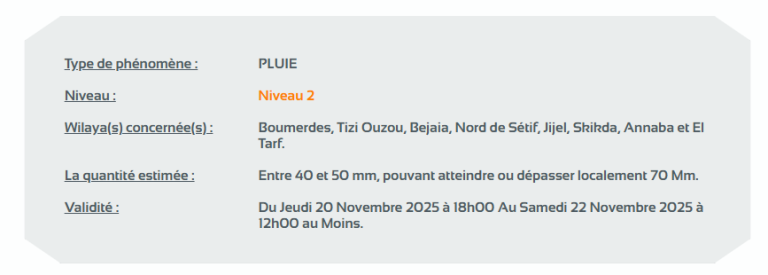 وحسب تنبيه للديوان الوطني للأرصاد الجوية من المستوى الثاني باللون البرتقالي على خريطة اليقظة، فإن الولايات المعنية بتساقط الأمطار التي تتراوح بين 40 ملم و50 ملم وقد تصل أو تتجاوز محليا الـ 70 ملم من الساعة السادسة مساءً من اليوم الخميس إلى غاية الساعة 12 زوالا من يوم السبت هي: بومرداس، تيزي وزو، بجاية، شمال سطيف، جيجل، سكيكدة، عنابة والطارف.