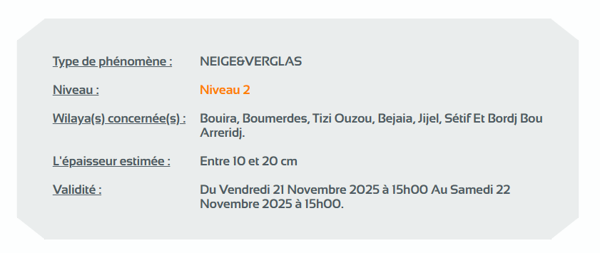 وحسب تنبيه للديوان الوطني للأرصاد الجوية من المستوى الثاني باللون البرتقالي على خريطة اليقظة، فإن الولايات المعنية بتساقط الثلوج التي يتراوح سمكها بين 10 و20 سنتيمتر هي: البويرة، بومرداس، تيزي وزو، بجاية، جيجل، سطيف، برج بوعريريج.