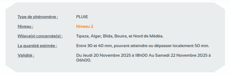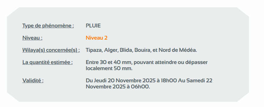 وحسب تنبيه آخر للديوان من المستوى الثاني باللون البرتقالي على خريطة اليقظة، ستتساقط الأمطار التي تتراوح بين 20 ملم و30 ملم وتصل أحيانا أو تتجاوز محليا الـ 50 ملم من الساعة السادسة مساءً من اليوم الخميس إلى غاية الساعة السادسة صباحا من يوم السبت على ولايات: الجزائر العاصمة، تيبازة، البليدة، البويرة وشمال المدية.