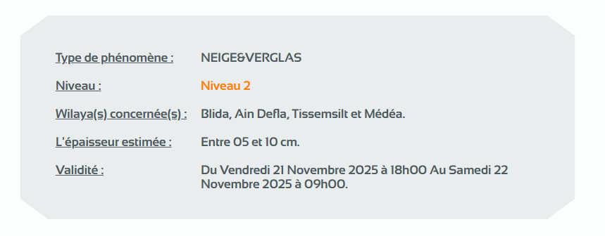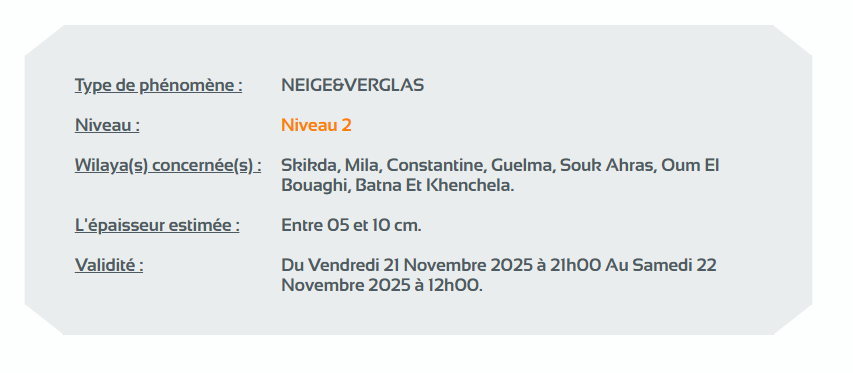 وحسب تنبيه آخر للديوان الوطني للأرصاد الجوية من المستوى الثاني باللون البرتقالي على خريطة اليقظة، فإن الولايات المعنية بتساقط الثلوج التي يتراوح سمكها بين 05 و10 سنتيمتر من الساعة التاسعة مساءً من يوم الجمعة لغاية الساعة 12 زوالا من يوم السبت هي: سكيكدة، ميلة، قسنطينة، قالمة، سوق أهراس، أم البواقي، باتنة، خنشلة، البليدة، عين الدفلى، تيسمسيلت والمدية.