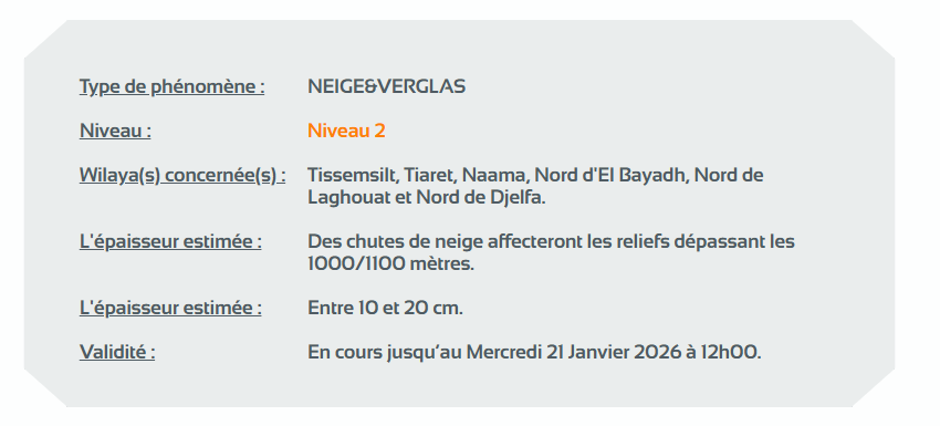 وحسب تنبيه للديوان الوطني للأرصاد الجوية من المستوى الثاني باللون البرتقالي على خريطة اليقظة، فإن الولايات المعنية بتساقط الثلوج التي يتراوح سمكها بين 10 و20 سنتيمتر على المناطق التي يزيد ارتفاعها عن 1100/1000 متر، هي: تيسمسيلت، تيارت، النعامة، شمال البيض، شمال الأغواط وشمال الجلفة.