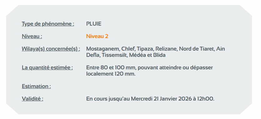 وحسب تنبيه آخر للديوان الوطني للأرصاد الجوية من المستوى الثاني باللون البرتقالي على خريطة اليقظة، فإن الولايات المعنية بتساقط الامطار الغزيرة جدا والتي تتراوح بين 80 و100ملم، ويمكن أن تصل محلياً إلى 120 ملم أو تتجاوزها. إلى غاية الساعة 12 زوالا من اليوم الأربعاء. هي: مستغانم، الشلف، تيبازة، غليزان، شمال تيارت، عين الدفلى، تيسمسيلت، المدية والبليدة.
