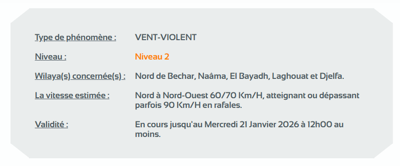 كما نبه الديوان في نشرية أخرى من المستوى الثاني باللون البرتقالي على خريطة اليقظة، من رياح قوية تتراوح بين 60 كلم/سا و70 كلم/سا وقد تصل أحيانًا إلى 90 كم/سا إلى غاية الساعة 12 زوالا من اليوم الأربعاء. على ولايات: شمال بشار والنعامة والبيض والأغواط والجلفة.