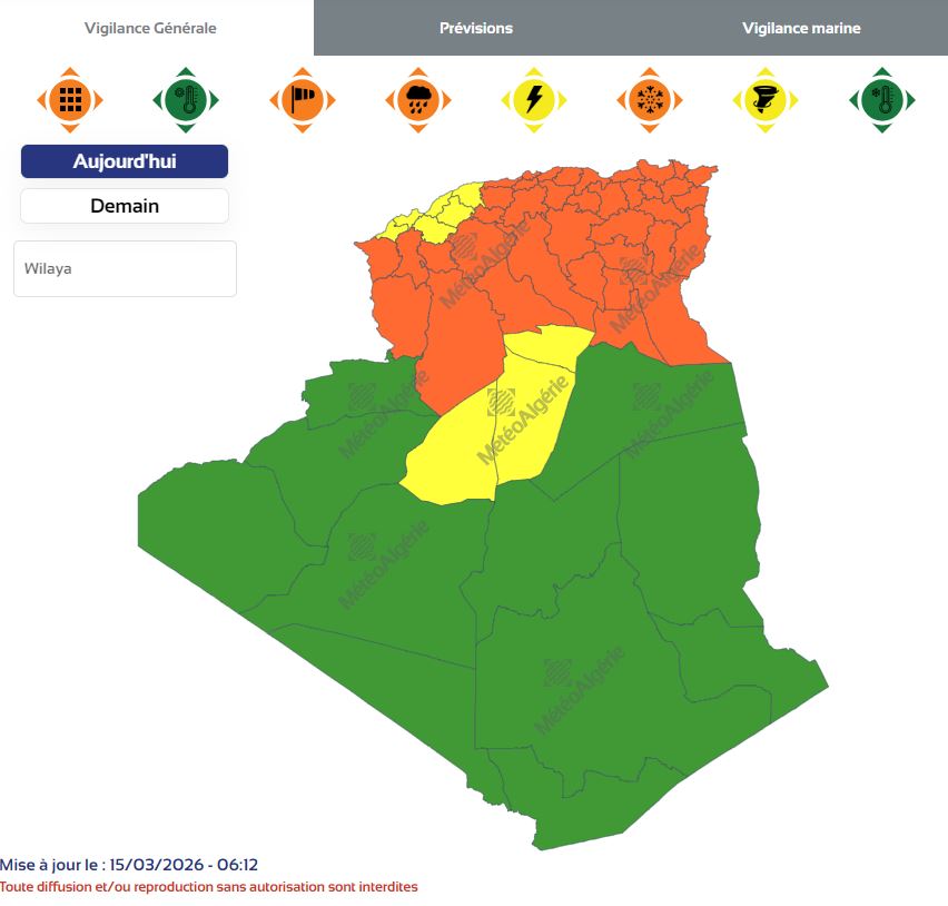وأشارت المصالح ذاتها إلى أن هذه النشرية ستكون سارية بداية من اليوم الأحد 15 مارس 2026 على الساعة 03:00 سا وتستمر إلى غاية يوم الإثنين 16 مارس 2026 إلى الساعة 09:00 سا.