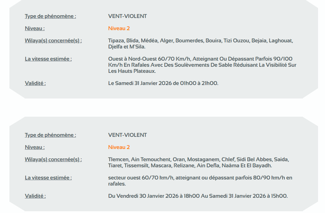وفي تنبيه من المستوى الأول جاء باللون الأصفر، حذرت المصالح ذاتها من رياح قوية عبر ولايات: عنابة، سكيكدة، بجاية، تيزي وزو، بومرداس، الجزائر، تيبازة، الشلف، مستغانم، وهران، عين تيموشنت، تلمسان، المسيلة، الجلفة الأغواط، تيارت، البيض، تيسمسيلت، غليزان، معسكر، سعيدة، سيدي بلعباس، النعامة،