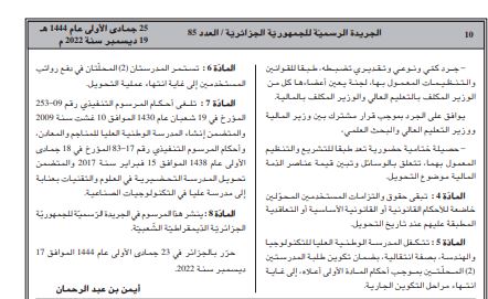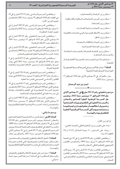 وتضمن العدد 85 من الجريدة الرسمية مرسوما تنفيذيا تحت رقم 22-440 مؤرخ في 23 جمادى الأولى عام 1444 الموافق 17 ديسمبر سنة 2022، يتضمن إنشاء مدرسة وطنية عليا للتكنولوجيا والهندسة.