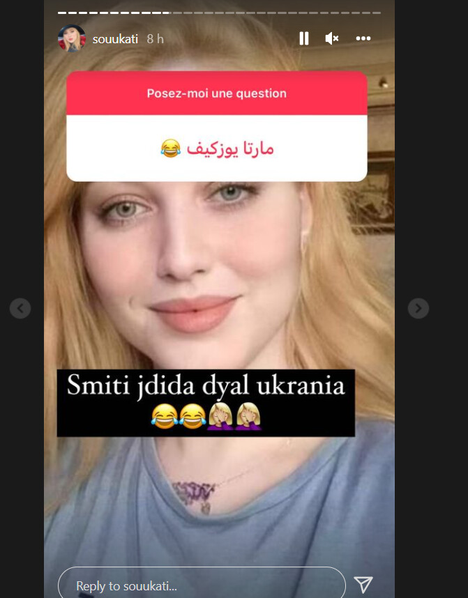 من جانبها سخرت العارضة المغربية التي تمتلك عدة حسابات على وسائل التواصل الاجتماعي، من الخبر عبر خاصية “ستوري” في منصة انستغرام، حيث كتبت: “مارتا يوزكيف.. تسميتي الجديدة بالأوكرانية”.