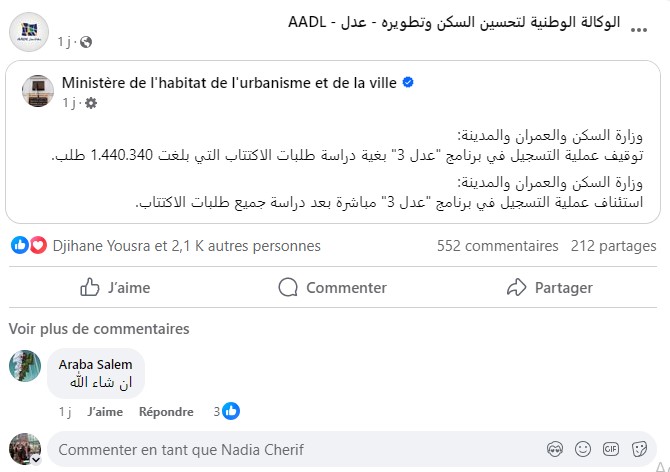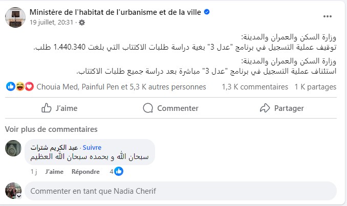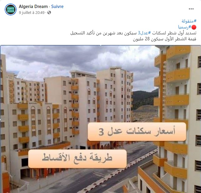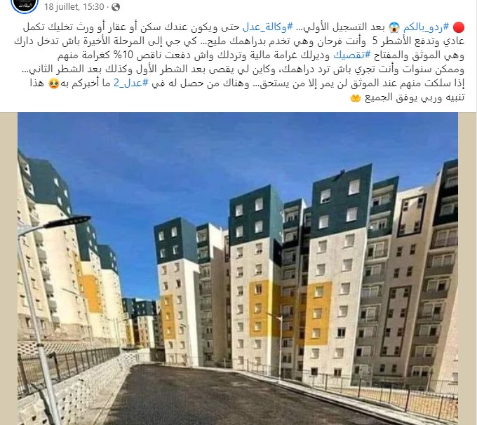 أيضا تروج بعض الحسابات المزيفة التي تحمل اسم عدل 3 لمعلومات بشأن قيمة السكنات والأشطر، وهو الأمر الذي لم تفصل فيه الوزارة المعنية بعد لأن الكلفة النهائية المعتمدة لحساب ثمن المسكن تحدد على أساس ثمن شراء الوعاء العقاري وكلفة مختلف الدراسات وأشغال الإنجاز وأشغال الطرق وشبكات تهيئة قطاع الخدمات، مضافا إليها مختلف مصاريف الخدمات المقدمة.