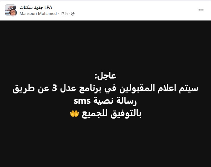 ومباشرة بعد إعلان وزارة السكن عن غلق منصة عدل لدراسة الطلبات مع الوعد بفتحها لاحقا، انتشرت عدة تدوينات مع وسم العاجل تقول أنه على المسجلين مراقبة هواتفهم لأن وكالة تطوير السكن سوف تقوم بإرسال رسائل نصية لإبلاغ المقبولين.