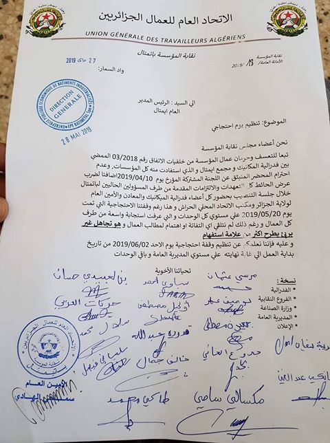 وقالت النقابة في بيانها، أن قرار تنظيم وفقة احتجاجية أخرى، بعد تلك المنظمة بتاريخ 20 ماي المنصرم، جاءت نتيجة لضرب المديرية العامة للمؤسسة، مطالبهم وكل التعهدات والإلتزامات المقدمة سابقا، عرض الحائط، والتي طرحت خلال جلسة التنصيب، بحضور كل أعضاء فديرالية الميكانيك والمعادن، والتمين العام لولاية الجزائر، ومكتب الإتحاد المحلي بالحراش، رغم المطالب المقدمة في الاحتجاج الأول الذي عرف استجابة واسعة لكل العمال، حسب ذات البيان-.