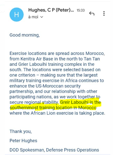 وقال بيتر هيوز الناطق باسم وزارة الدفاع الأمريكية لموقع “الشروق أون لاين”، ردا على سؤال بشأن المعلومات المتداولة حول إقامة التدريبات في أراضي الصحراء الغربية: “تنتشر مواقع التمرينات في جميع أنحاء المغرب، من قاعدة القنيطرة الجوية في الشمال إلى طانطان وقاعدة جرير لبوحي في الجنوب”.