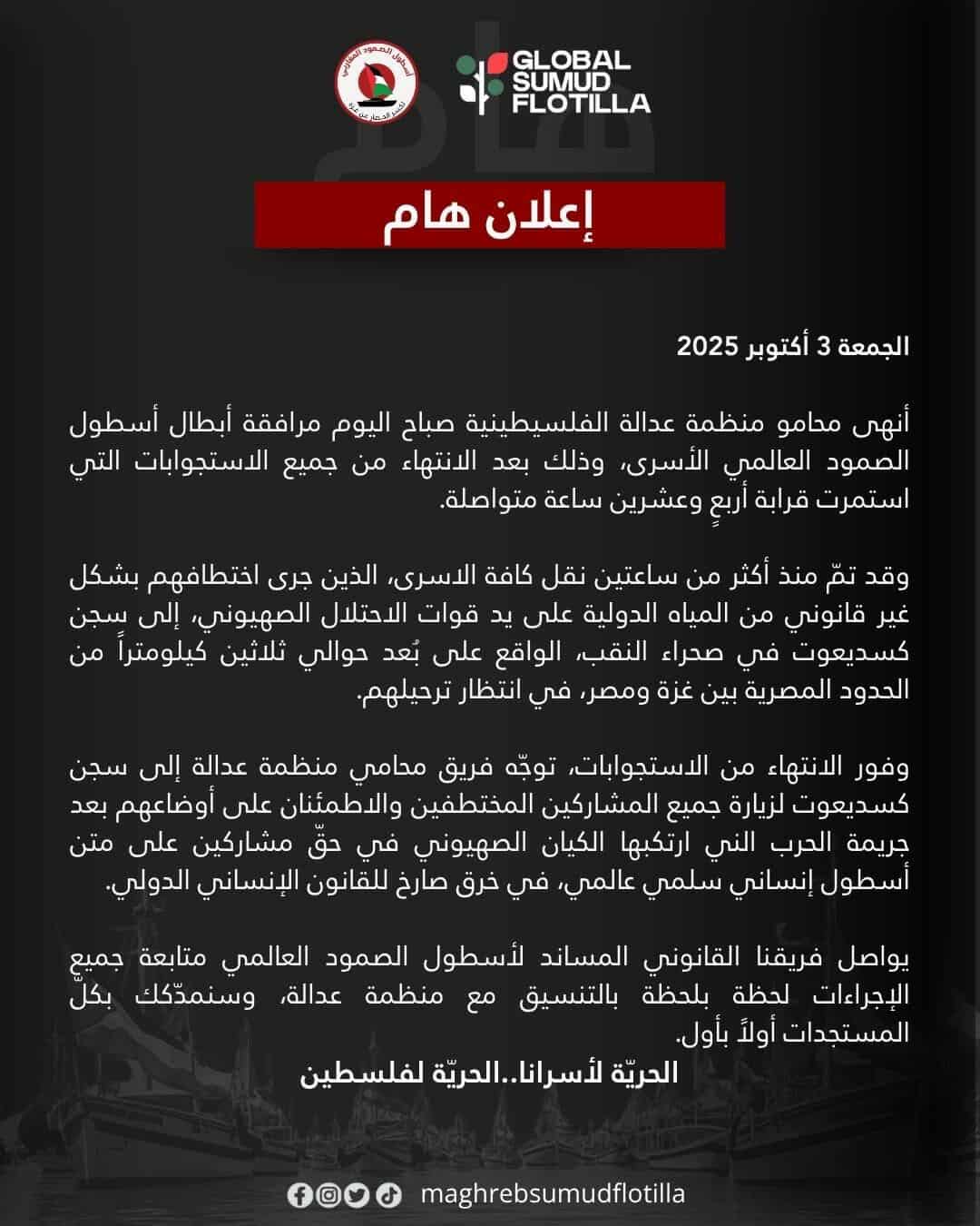 وأفاد المحامون في منشور لهم أنه قد تم منذ أكثر من ساعتين نقل كافة الاسرى، الذين جرى اختطافهم بشكل غير قانوني من المياه الدولية على يد قوات الاحتلال الصهيوني، إلى سجن كتسيعوت في صحراء النقب، الواقع على بعد حوالي ثلاثين كيلومتراً من الحدود المصرية بين غزة ومصر، في انتظار ترحيلهم.