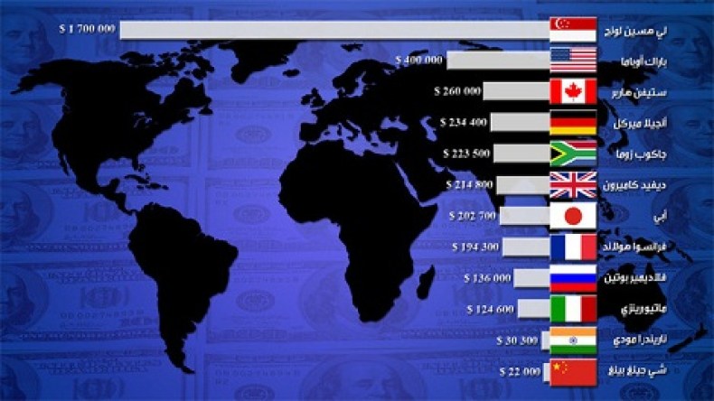 ويتقاضى الرئيس الأمريكي باراك أوباما 400 ألف دولار كل عام، أما رئيس الوزراء الكندي فيبلغ راتبه السنوي 260 ألف دولار.