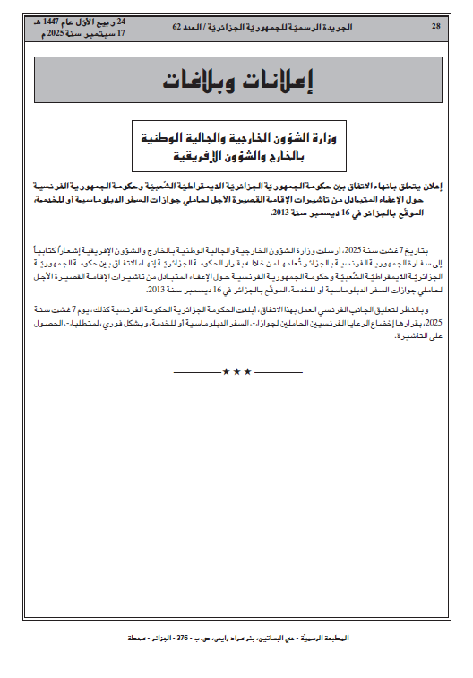 وبالنظر لتعليق الجانب الفرنسي العمل بهذا الاتفاق، أبلغت الحكومة الجزائرية الحكومة الفرنسية كذلك بأنه بعد 7 غشت سنة 2025، بقرارها إخضاع الرعايا الفرنسيين الحاملين لجوازات السفر الدبلوماسية أو للخدمة وبشكل فوري لمتطلبات الحصول على التأشيرة”.
