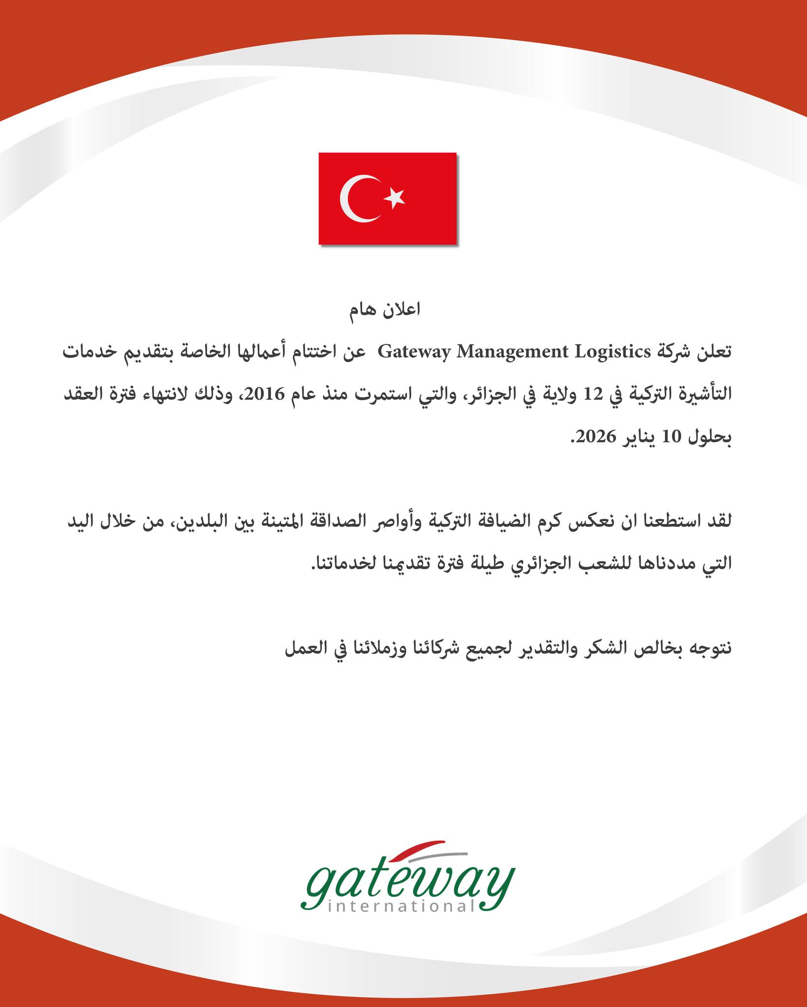 أعلن مركز تقديم طلبات التأشيرة التركية بالجزائر عن اختتام أعماله الخاصة بتقديم خدمات التأشيرة التركية في 12 ولاية عبر التراب الوطني، وذلك ابتداءً من 10 جانفي 2026، عقب انتهاء فترة العقد الذي انطلق منذ سنة 2016.