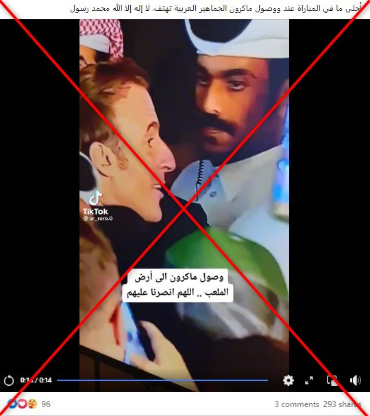 وكتب على الفيديو نفسه “وصول ماكرون إلى أرض الملعب… اللهم انصرنا عليهم”. كما علّق مشاركو الفيديو بالقول “أحلى ما في المباراة عند وصول ماكرون الجماهير العربيّة تهتف لا إله إلا الله محمّد رسول الله”.