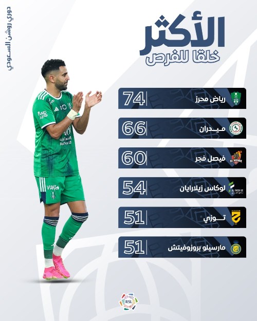 ونشرت الرّابطة التي تُشرف على شؤون البطولة السعودية، الإثنين، إحصائية كشفت في طيّاتها عن تصدّر محرز لائحة أفضل اللاعبين صنعا للفرص في هذا الدوري، وذلك بِرصيد 74 فرصة. مُتقدّما عن صاحب المركز الثاني بِفارق 8 خطوات، والأمر يتعلّق بِاللاعب الإسباني ألفارو ميدران متوسّط ميدان نادي الاتفاق.