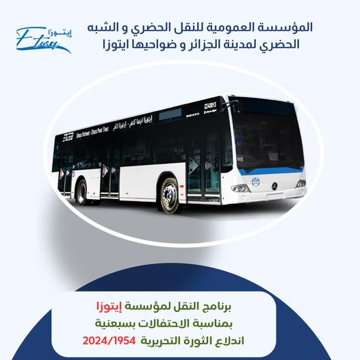 أعلنت المؤسسة العمومية للنقل الحضري والشبه الحضري لمدينة الجزائر “ايتوزا” عن مجانية النقل عبر كامل خطوطها، بما في ذلك المدرج والمصعد الميكانيكي وذلك بمناسبة الاحتفالات بالذكرى السبعين لاندلاع الثورة التحريرية المظفرة، والمصادف للفاتح من نوفمبر من كل سنة.