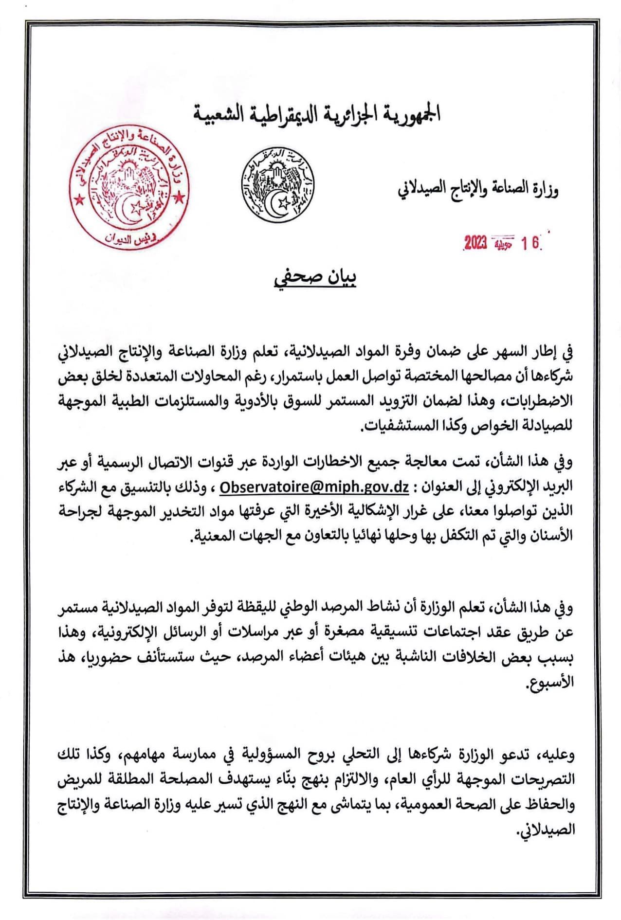 كما أعلمت الوزارة في بيانها انها مصالحها تعمل باستمرار “لضمان التزويد المستمر للسوق بالأدوية والمستلزمات الطبية الموجهة للصيادلة الخواص وكذا المستشفيات”.