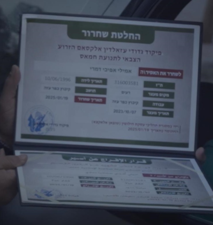 وكُتب في الشهادة التي منحتها القسام للأسيرات: “قرار إفراج عن أسير”، وتضمنت الإسم، العمر، تاريخ الميلاد، وتاريخ الأسر والإفراج، وعليها الختم الرسمي للكتائب.