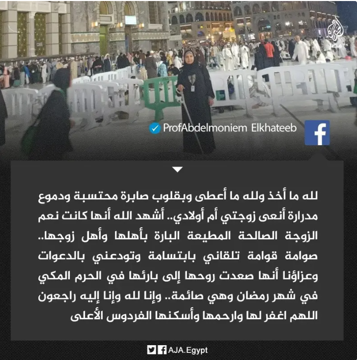 وتضامن سعوديون عبر شبكات التواصل الاجتماعي مع زوج المعتمرة الراحلة، الجراح بكلية الطب بجامعة أسيوط، والذي نعاها بالقول: “لله ما أخذ ولله ما أعطى، وبقلوب صابرة محتسبة، ودموع مدرارة، أنعى زوجتي أم أولادي، توأم روحي، ورفيقة دربي، زهرة فؤادي، حسنتي في الدنيا، وبسمتي، وقسمتي، وجليستي، وأنيستي”.